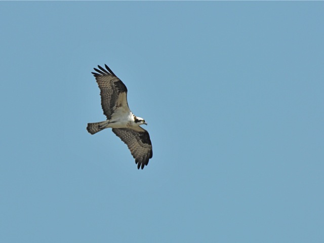 While we were there, four Ospreys soared and called over and over again around the same area, though they did not approach the nest or its tree. It seems likely that the nest originally belonged to one of these pairs, and we wondered what they would do, now that it’s been taken over by the owls. After getting back home, I looked this up, and learned that Great Horned Owls not only often take over nests of other raptors – they do not build nests of their own – but also that they are considered serious predators of Ospreys, often taking fledglings and even the adults.
